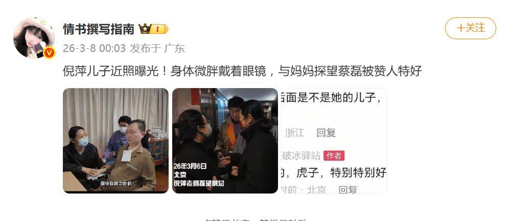 据3月8日网友爆料,67岁的倪萍带着27岁的儿子虎子(大名王倪)在北京罕见同框,一同探望渐冻症抗争者蔡磊。这位几乎被公众遗忘的“星二代”,凭借壮实如塔的身材和全程低调温和的陪伴,瞬间刷屏网络,一句现场人员给出的评价“人特好”,更是让无数网友直呼“没想到”。